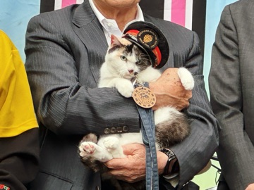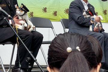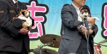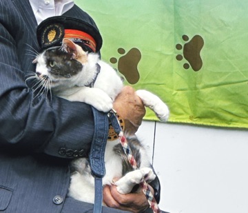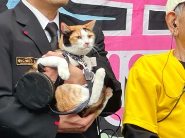 ニャーニャーないて少し興奮気味ですが和歌山電鉄社長の小嶋光信さんにしっかり抱っこされての登場です。