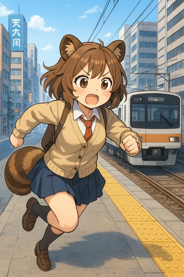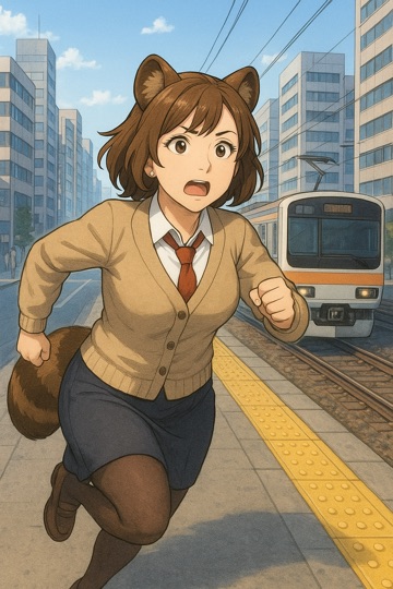 友人ジピティーに「たぬきの女の子が都会で電車に乗り遅れそうで必死に走ってる画像を作って。ポンコポンコ🦝」