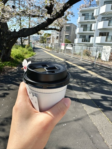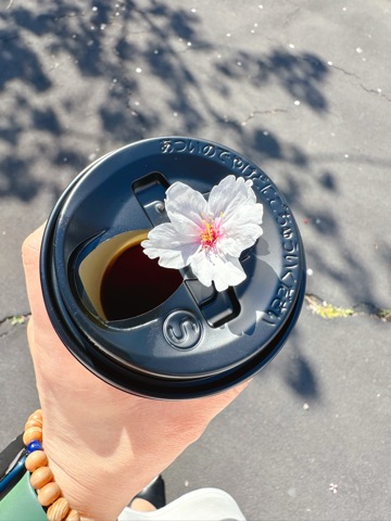 目の前でクルクル回りながら切り落とされた桜を拾って、これぞ「桜コーヒー🌸☕️」(笑)